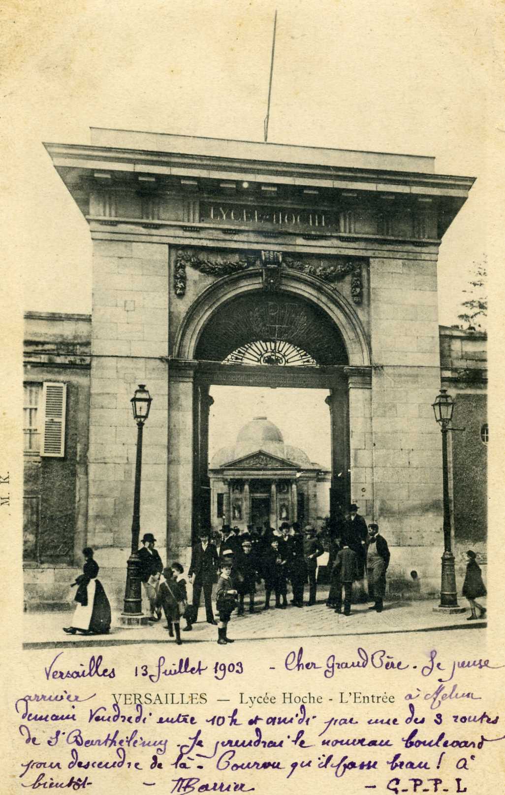 Envoi d'un souvenir du lycée Hoche sous forme de carte postale. Témoignage de la vie quotidienne dans les lycées vers 1900. Présence importante des élèves à Versailles.
