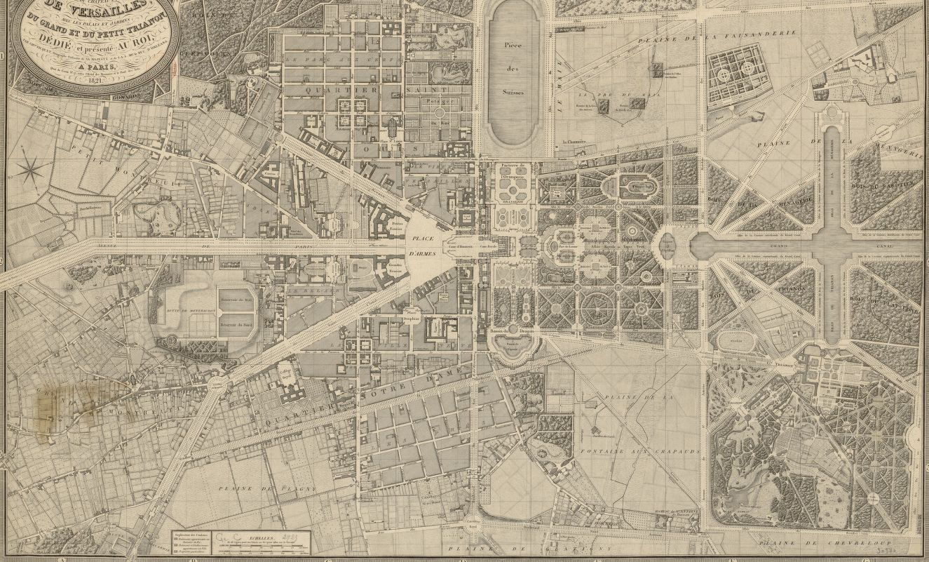 Le quartier des Prés est en pleine construction. Le boulevard de la Reine délimite le terrain au Nord (en bas de la carte) en bordure duquel des lotissements sont aménagés. Le quartier de Clagny n'existe pas encore et la rue de Provence est dénommée ainsi à cette époque.