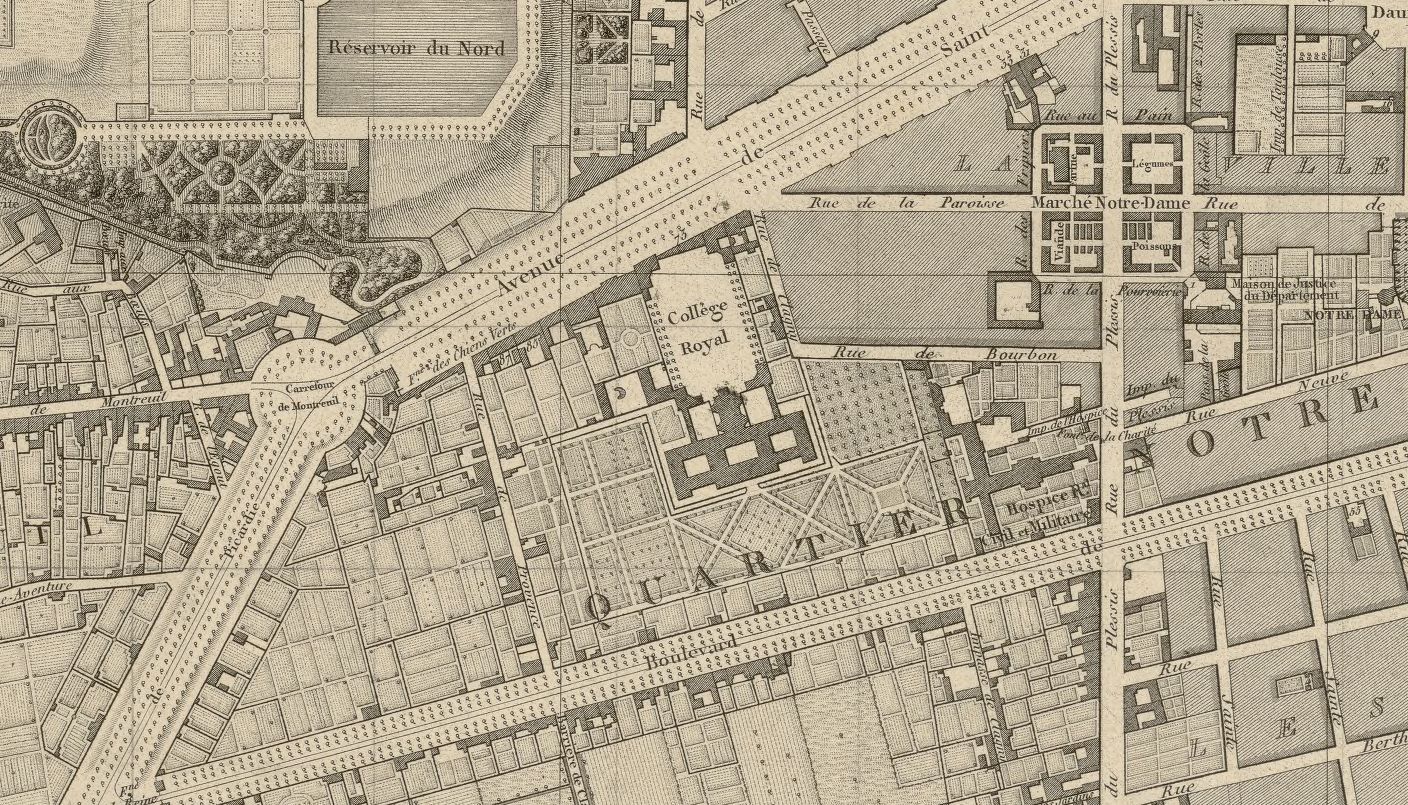 La carte est très précise et montre clairement l'ancien couvent avec ses trois cloîtres et ses jardins. Il est nommé collège royal. La terrasse est complète, les galeries reliant les parloirs aux bâtiments conventuels ne sont pas encore doublées.